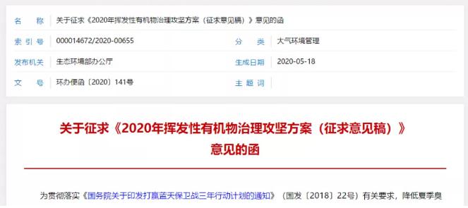 為貫徹落實《國務院關于印發打贏藍天保衛戰三年行動計劃的通知》(國發〔2018〕22號)有關要求,降低夏季臭氧污染影響,前幾日,生態環境部組織編制了《2020年揮發性有機物治理攻堅方案(征求意見稿)》。