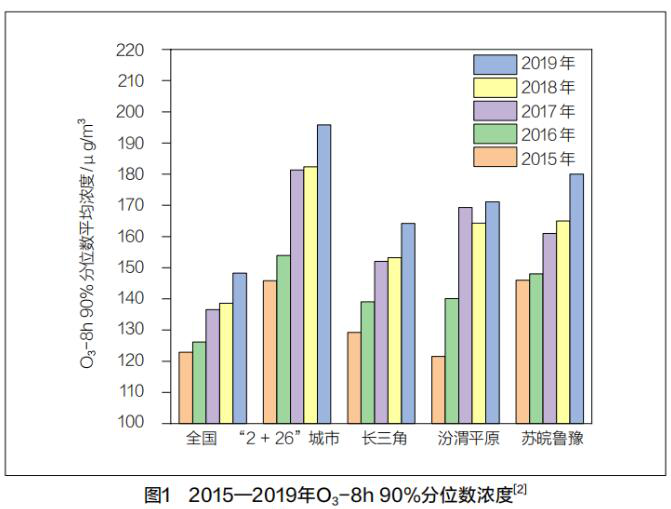 自2013年相繼實施《大氣污染防治行動計劃》《打贏藍天保衛戰三年行動計劃》以來,我國環境空氣質量改善效果明顯,空氣中二氧化硫(SO2)、二氧化氮(NO2)、可吸入顆粒物(PM10)、細顆粒物(PM2.5)、一氧化碳(CO)濃度顯著下降,尤其是PM2.5污染控制取得顯著成效,但是臭氧(O3)污染卻呈逐年加重的趨勢,O3污染防控形勢嚴峻。