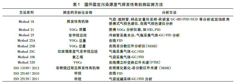 美國環保署推出的VOCs監測方法有環境空氣VOCs分析方法、室內空氣VOCs分析方法和固定源廢氣VOCs分析方法。固定污染源廢氣多采用在線分析儀進行現場分析,如在線GC-MS /FID/PID/ECD 等,還可使用傅立葉變換紅外光譜和非分散紅外分析儀,還可將廢氣采集于氣袋或氣瓶中后再進行分析。國際標準化組織( ISO) 也發布了關于VOCs檢測的標準方法,對于固定源廢氣主要采用在線方法,如催化氧化-非分散紅外光譜、GC/FID 等。具體監測方法見表1。